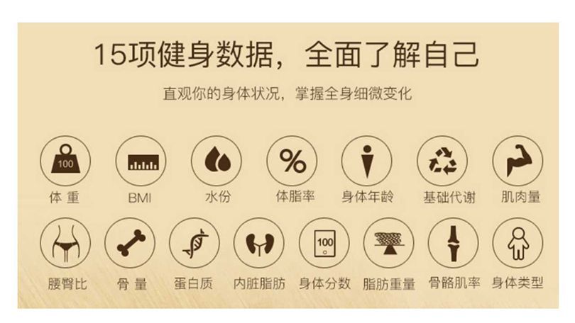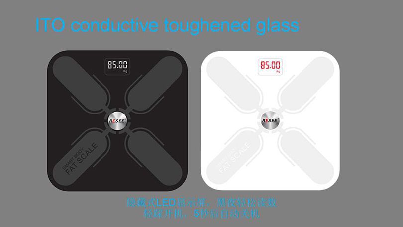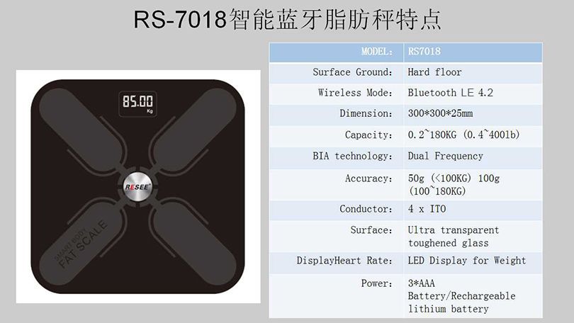 秤面:平面 無(wú)線鏈接:無(wú)線藍(lán)牙4.2,可定制WiFi連接功能 尺寸:300*300*25mm 容量:0.2~180KG (0.4~400lb) BIA技術(shù):雙頻率 準(zhǔn)確性:50g (<100KG) 100g (100~180KG) 面板材料:4*ITO 玻璃材料 表面:光滑高硬度鋼化玻璃 顯示屏幕:LED顯示屏的重量 供電方式:3 * AAA電池/充電鋰電池